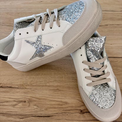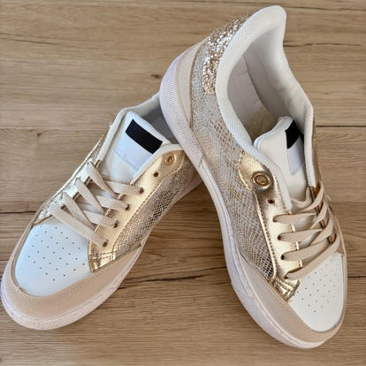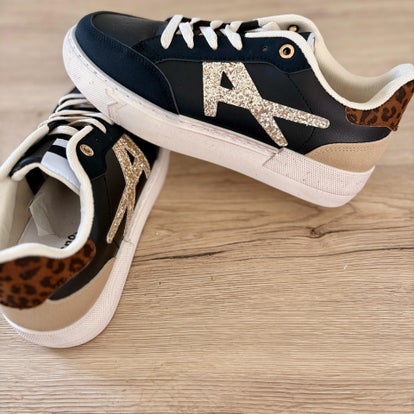 Baskets pour femmes noir et avec une pointe de léopard derrière.